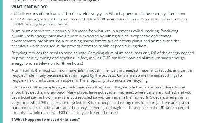 ЧТО МЫ МОЖЕМ СДЕЛАТЬ? Ежегодно в мире продается 475 миллионов банок напитков. Что происходит со всеми этими пустыми алюминиевыми банками? Удивительно, многие из них переработаны! Алюминиевая банка разлагается на свалке за 100 лет. Так что переработка имеет смысл. Алурминиум не встречается в природе. Его получают из бокситов способом, называемым плавкой. Производство алурниния энергоемко. Бокситы добываются путем добычи, которая является дорогостоящей и создает проблемы для окружающей среды, добыча бокситов вредит лесам, что сказывается на растениях и животных, а химические вещества, используемые в процессе, влияют на здоровье людей, живущих там. Повторное использование снижает потребность в добыче баксита. Переработка алюминия потребляет только 5% энергии, необходимой для его производства при добыче и плавке. Фактически, изготовление ОДНОЙ банки из переработанного алюминия позволяет сэкономить достаточно энергии для работы телевизора в течение трех часов! Алюминий - самый распространенный мазерлат в современной жизни. Это самый дешевый материал для вторичной переработки, и его можно перерабатывать бесконечно, потому что он не повреждается упаковкой. Банки также являются самым простым в переработке - новые банки для днини могут появиться в магазинах только через шесть недель после переработки! в некоторых странах люди платят дополнительно за каждую покупку. Если они утилизируют банку или вернут ее в магазин, они получат эти деньги обратно. Во многих местах есть специальные машины для измельчения банок, и вы получаете билет, в котором указано, сколько банок вы переработали, чтобы вы могли вернуть деньги: В Швеции, где это очень успешно, 92% банок перерабатываются. В Британии люди продают пустые банки на благотворительность. Есть несколько сотен мест, где можно купить банки, а потом их перерабатывать. Только представьте - если бы все банки в Великобритании были переработаны Походите, это принесло бы более 30 миллионов евро в год на благие дела!