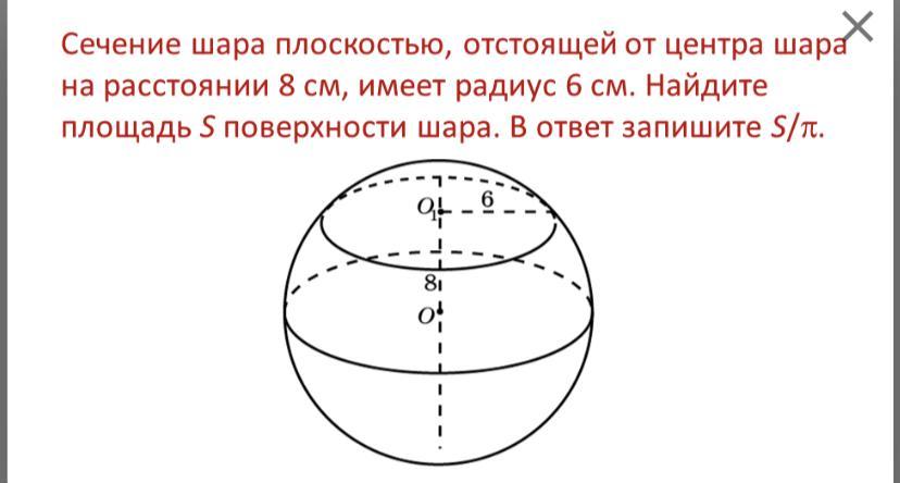 Сечение шара плоскостью, отстоящей от центра шара на расстоянии 8 см, имеет радиус 6 см. Найдите площадь поверхности шара.