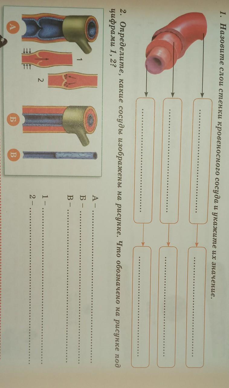 2. А-вена, Б-артерия, В-капилляр, 1-сжатие вены, 2- кармановидные клапаны в вене закрылись, не давая крови течь в другом направлении