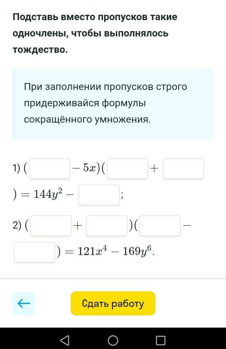 1) (12у-5х)(12у+5х)=144у²-25х²