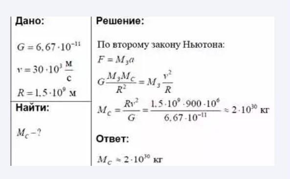 Рассчитайте массу Солнца, зная, что средняя скорость движения Земли по орбите составляет 30 км/с, а радиус земной орбиты равен 1,5*10^8 км.