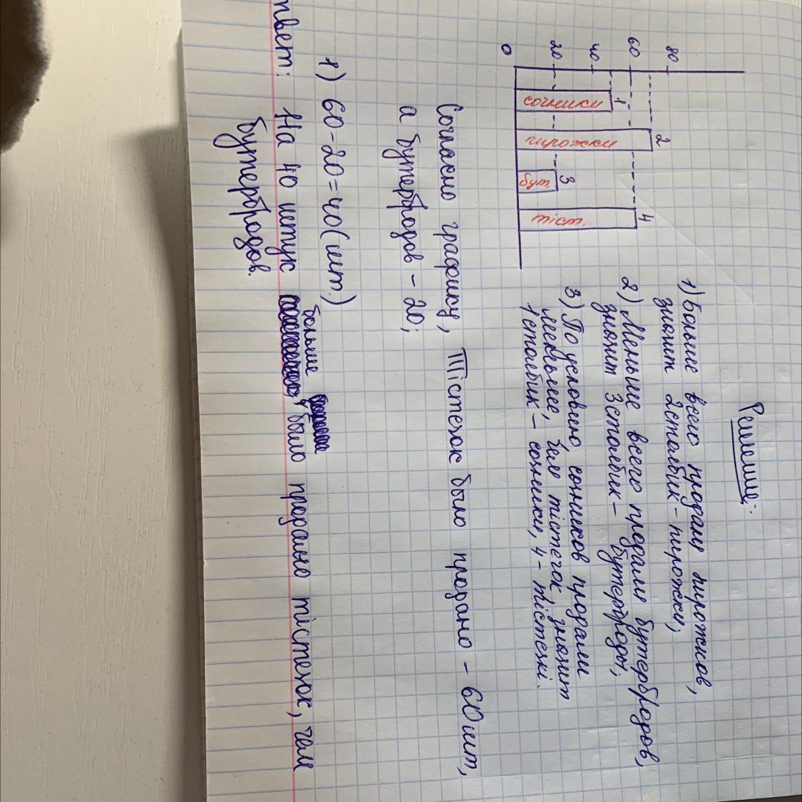 3) По условию, сочников продали меньше, чем тiстечок, значит 1 столбик - сочники, 4 - тiстечкi.