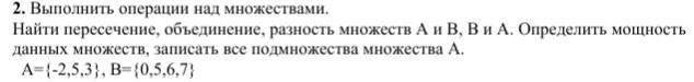 Найти пересечение, объединение, разность множеств А и В, В и А. Определить мощность
