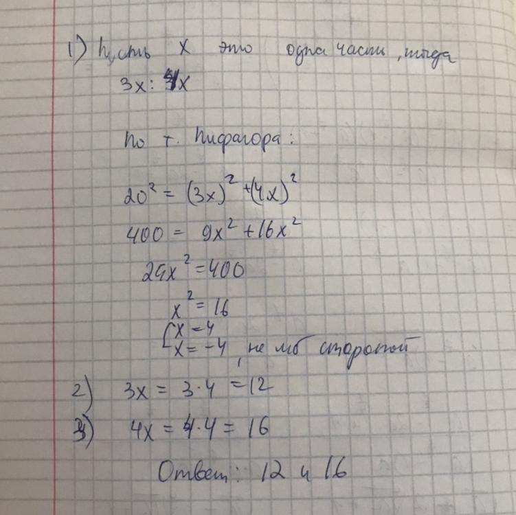 гипотенуза прямоугольного треугольника равна 20см а катеты относятся как 3:4 чему равны катеты этого треугольника