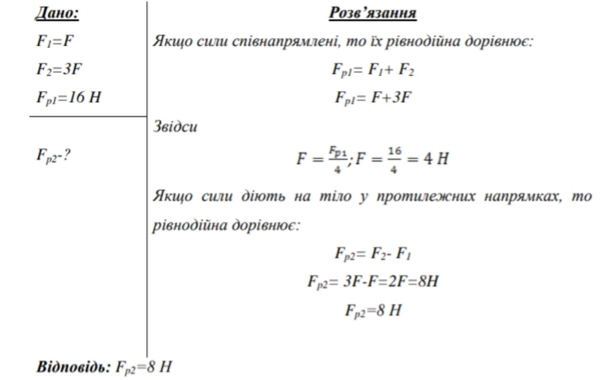 більша за першу. Рівнодійна цих сил дорівнює 16 Н. визначити рівнодійну цих