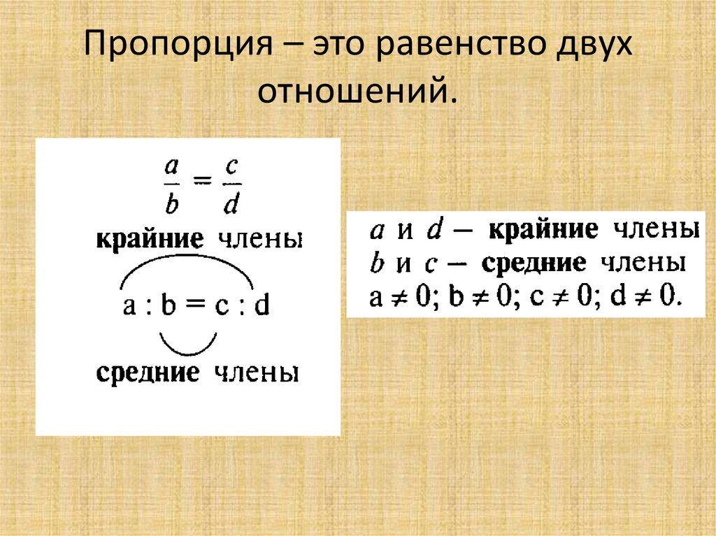 Пропо́рция — равенство отношений двух [и более] пар чисел. и. , т. е. равенство вида. , или, в других обозначениях, равенство.