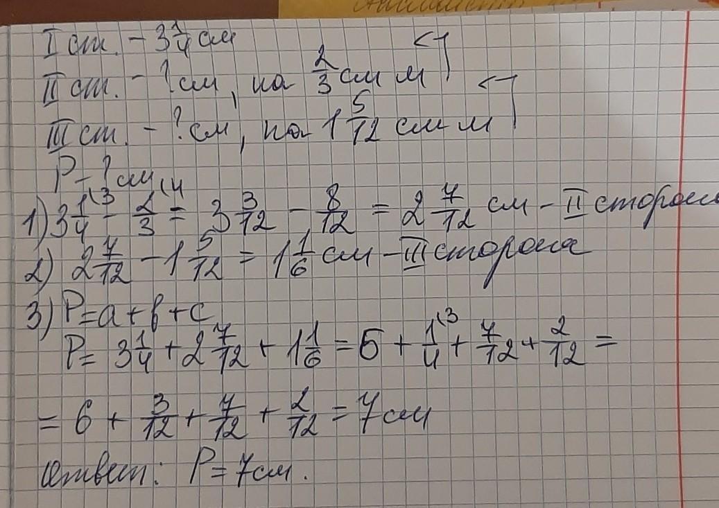 Одна сторона треугольника равна 3 1/4 см. Вторая сторона меньше 2/3 см, а третья сторона меньше 1 5/12 см от второй. Найдите периметр треугольника.