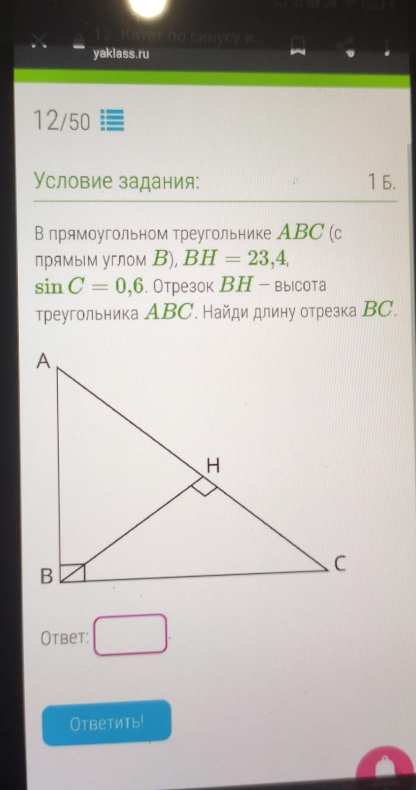 прямым углом В), BH = 23,4,