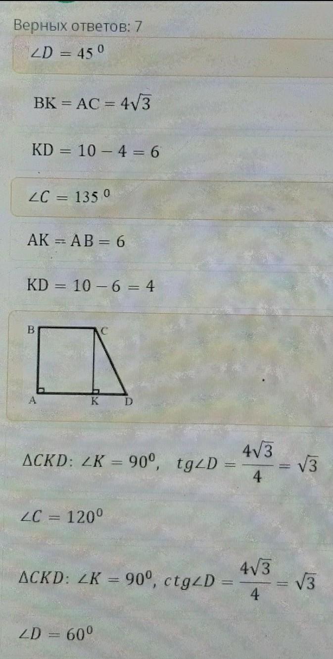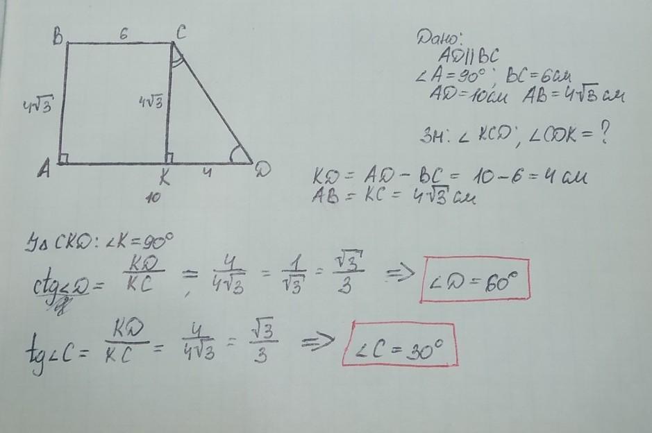AB=4v3 см, СК - Высота. Найдите углы трапеции, прилежащие к ее большей