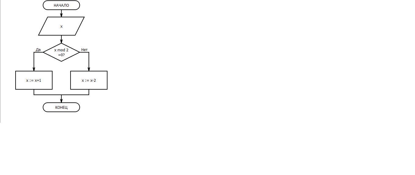 блок схемы . Проверить, четное ли число. Если да, то прибавить к нему 1, если нет, то отнять 2. (A mod 2=0)
