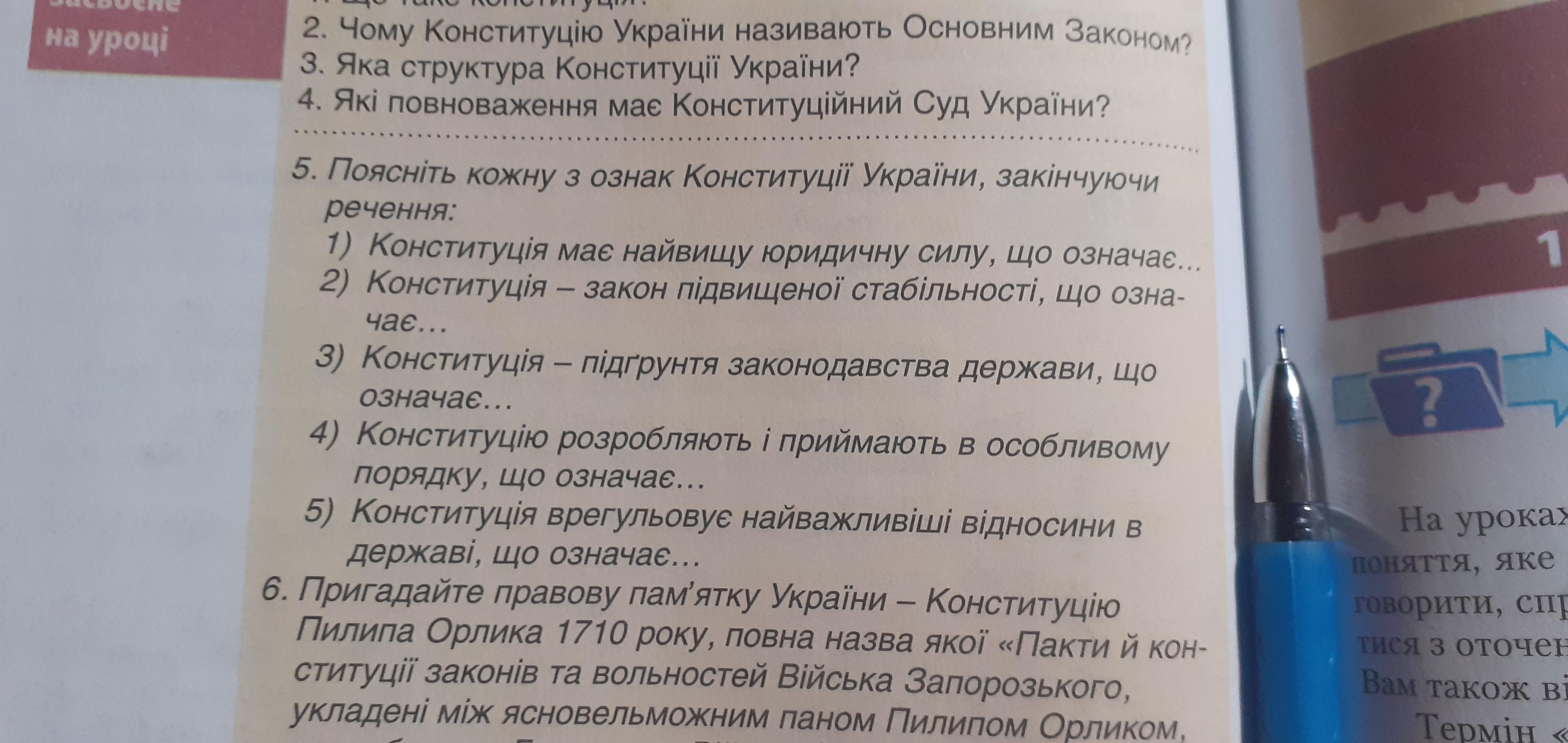 5. Поясніть кожну з ознак Конституції України, закінчуючи речення: