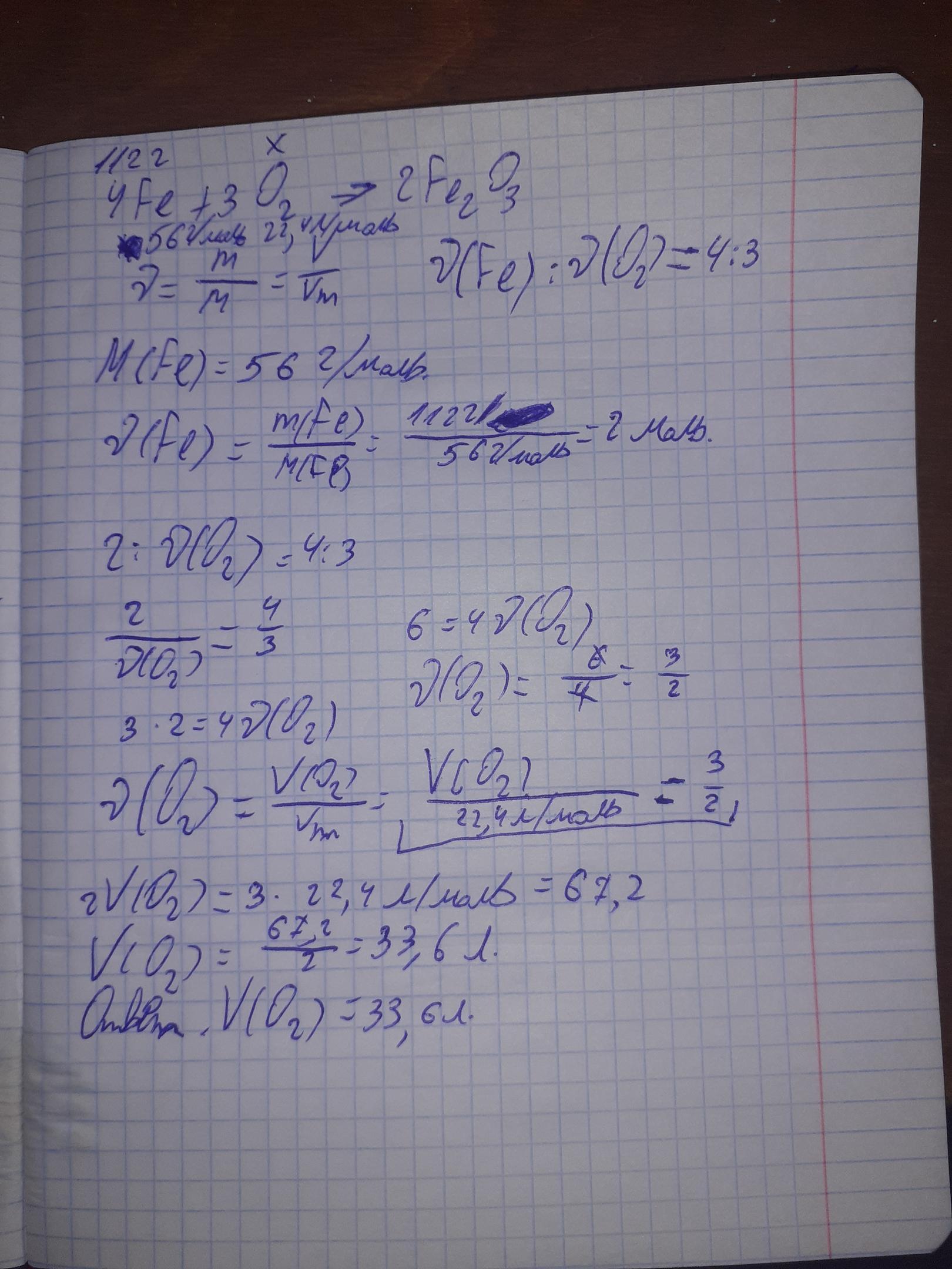 6Fe + 4O2= 2Fe3O4 n (ню-кол-во вещ-ва)= m:M 1) n(Fe)= 112г : 56 г\моль=2 моль Обозначим n(O2) за X, тогда Х= 2моль *4 моль: 6 моль= 1, 333 моль n(O2)= 1,333 V= n* Vm 2) v(O2)= 1,333* 22,4=29,859