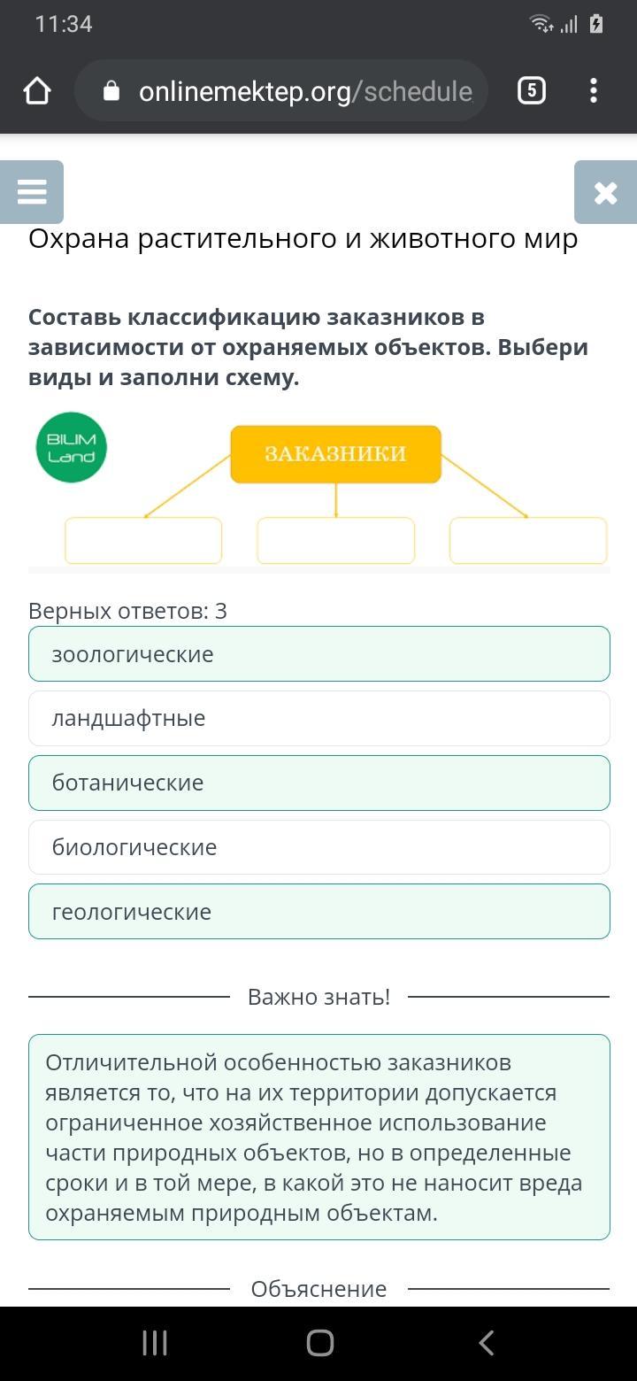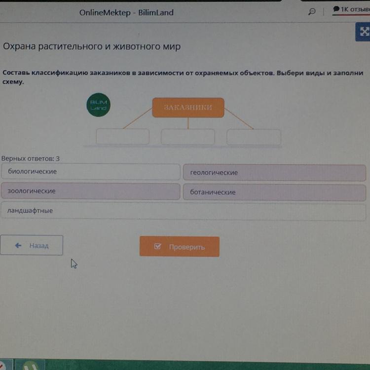 Составь классификацию заказников в зависимости от охраняемых объектов. Выбери виды и заполни