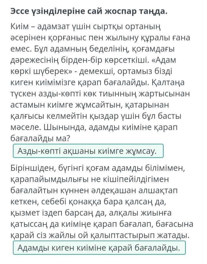 ответ: 1-Азды-көпті ақшаны киімге жұмсау, 2-Адамды киген киіміне қарай бағалайды.