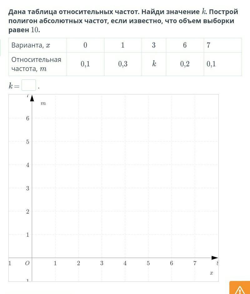Дана таблица относительных частот. Найди значение k. Построй полигон абсолютных частот, если известно, что объем выборки равен 10
