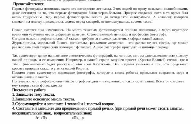 Ответ:1-Фотографы,2-основная смысль бережное отношение к истории.Твой друг хочет быть фотографом или же полицейским?мишка кричит:Учительница я не выучил уроки!саша спрашивает:Сегодня выйдешь на улицу?Сегодня будет экзамен!-сказала учительница.Я сегодня получил пять!-сказал Александр