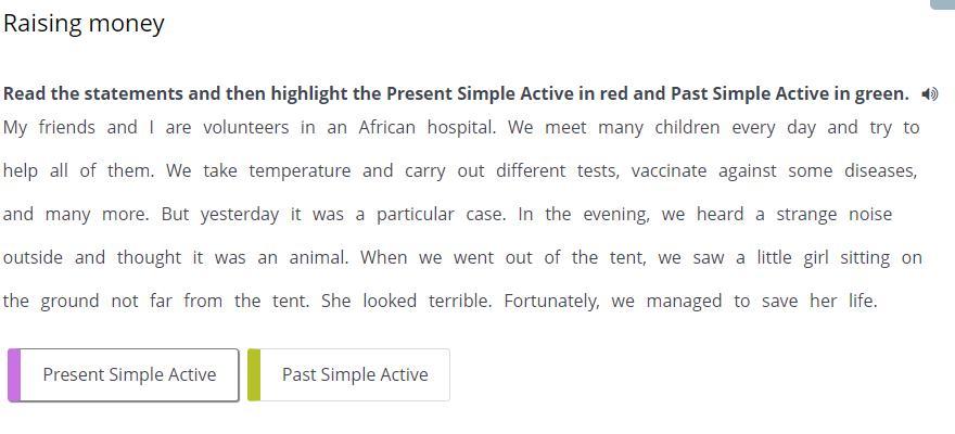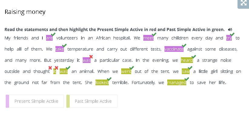Read the statements and then highlight the Present Simple Active in red and Past Simple Active in green.