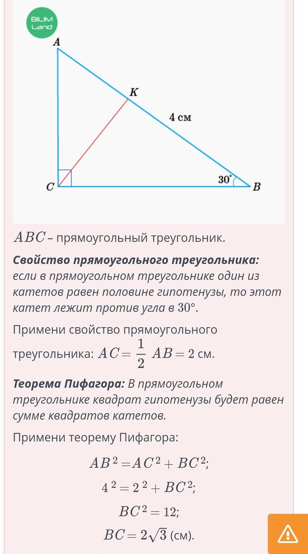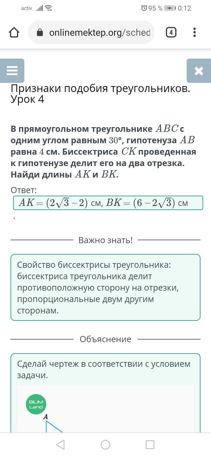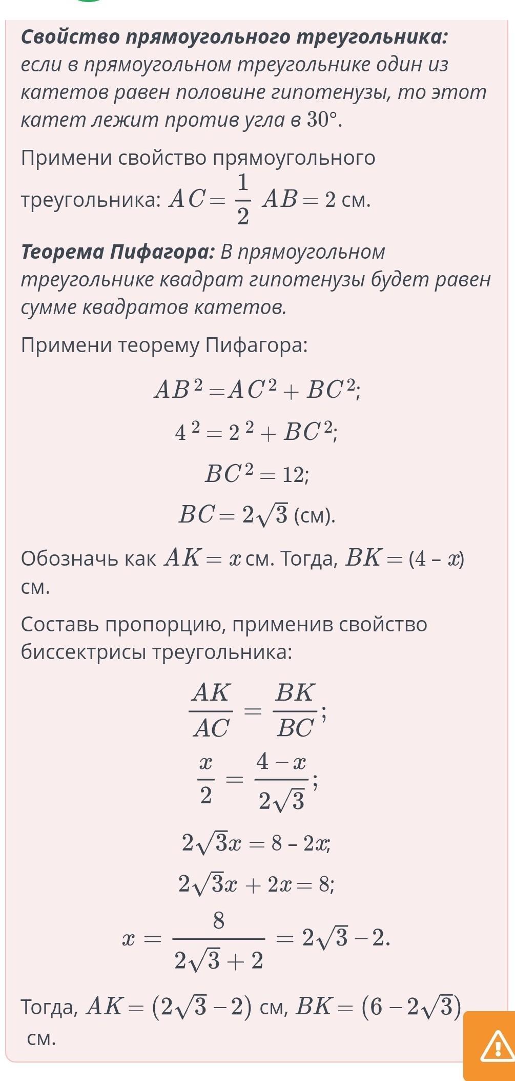 В прямоугольном треугольнике ABC с одним углом равным 30°, гипотенуза AB равна 4 см. Биссектриса CK проведенная к гипотенузе делит его на два отрезка. Найди длины AK и BK.