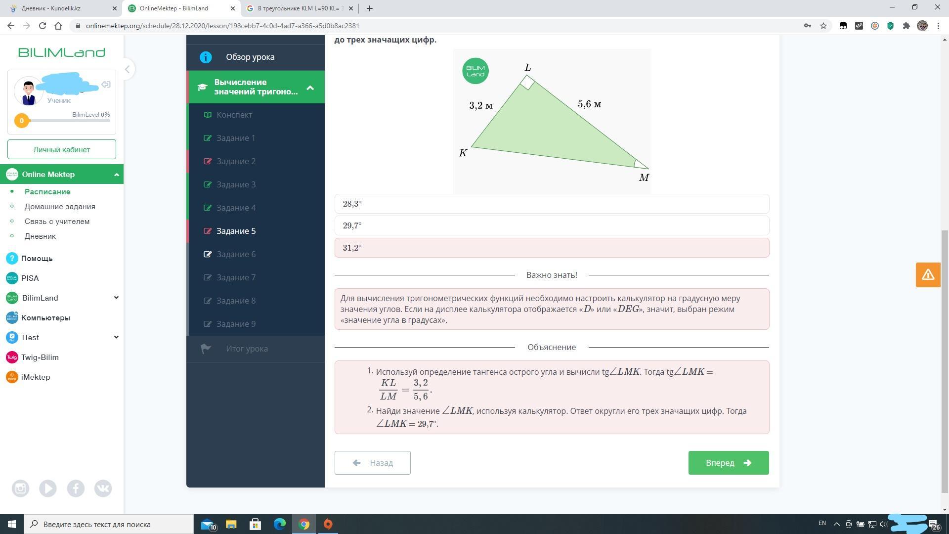 В треугольнике KLM: угол L=90°, KL=3,2м и LM=5,6м. Найти величину угла LMK. Ответ округлите до трёх значащих цифр