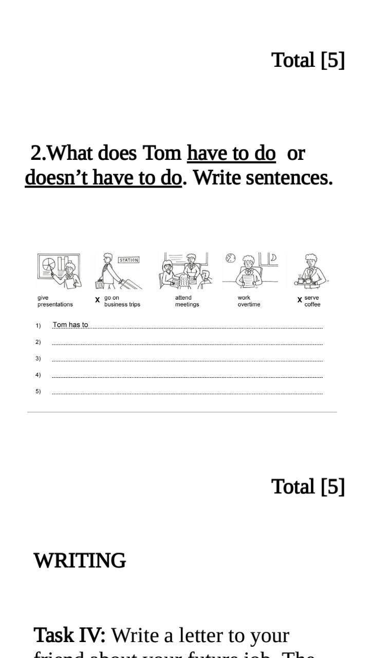 2.What does Tom have to do or doesn’t have to do. Write sentences.