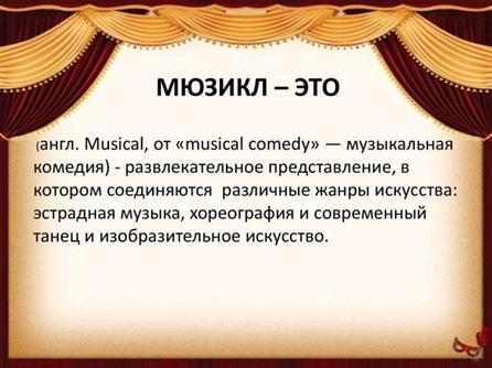 1) Мьюзикл - музыкальное представление или комедийный фильм с использованием элементов эстрады, оперетты и балета.