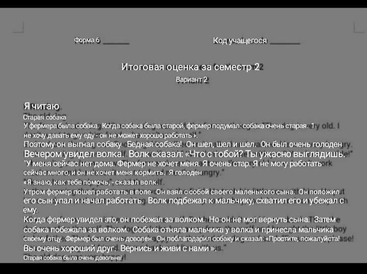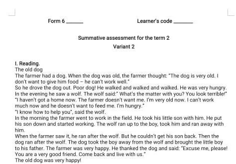 AN 83% 12:52 6-форма Лернер коды 2-нұсқаға арналған жиынтық бағалау оған фауд бергісі келеді - ол жақсы жұмыс істей алмайды »Сондықтан ол итті шығарып салды. Бейшара ит! Ол жүрді және белбеді және жүрді. Ол қатты аш болды. Кешке ол қасқырды көрді. Қасқыр: «Саған не болды? Сұмдыққа ұқсайсың» Менде қазір үй жоқ, фермер мені қаламайды. Мен қазір өте маңыздымын. Мен қазір көп жұмыс істей алмаймын және ол мені тамақтандырғысы келмейді. Мен қарным ашты * мен саған қалай көмектесетінімді білемін «, - деді қасқыр. Таңертең фермер далаға жұмысқа кетті. Ол кішкентай ұлын ертіп, ұлын жерге отырғызып, жұмыс істей бастады. Қасқыр жүгіріп шықты баланы алып, оны алып қашып кетті.Фермер мұны көргенде қасқырдың артынан жүгірді.Бірақ ол баласын қайтара алмады.Содан кейін ит қасқырдың артынан жүгірді.Ит баланы баланы ауладан алып кетті. қасқыр кішкентай баланы әкесіне алып келді.Фермер өте қуанды, ол итке алғысын білдіріп: «Кешіріңіз, өтінемін! Сіз өте жақсы доссыз. Қайтып келіп, бізбен бірге тұрыңыз. «Кәрі ит қатты қуанды! 3AKPBITB