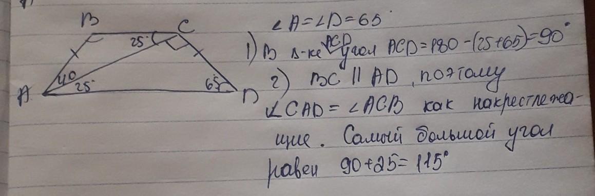 Найдите большой угол равнобедренной трапеции ABCD если диагональ AC образует с основанием AD и боковой стороной AB углы, равные 25° и 40° соответственно.