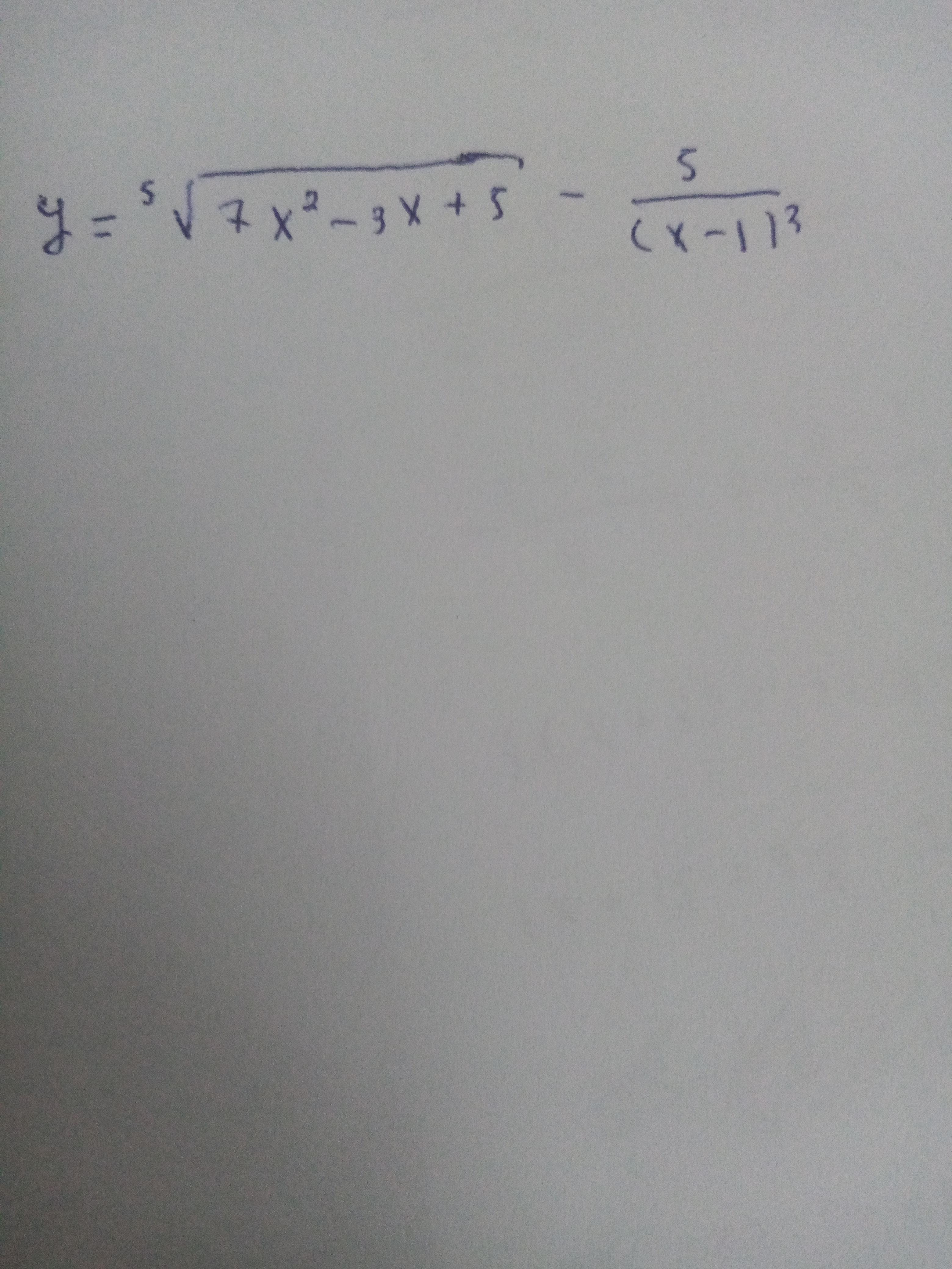 y =  \sqrt[5]{7 {x}^{2}  - 3x + 5}  -  \frac{5}{ {(x - 1)}^{3} }  =  \\  =  {(7 {x}^{2} - 3x + 5) }^{ \frac{1}{5} }  - 5 {(x - 1)}^{ - 3}