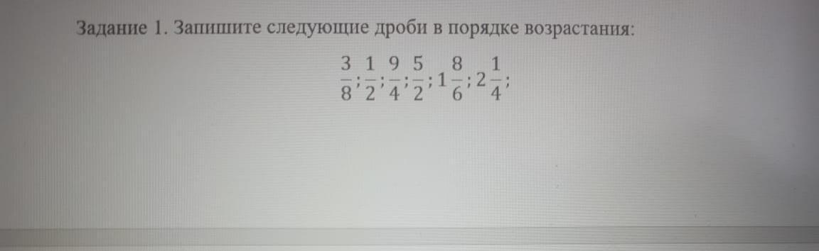 запишите следующие дроби в порядке возрастания 3/8; 1/2; 9/4; 5/2; 8/6; 2 1/4