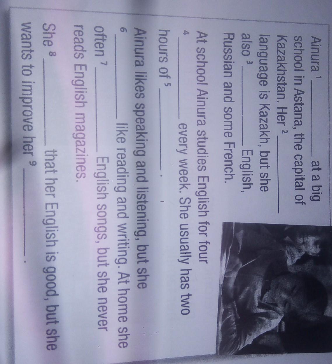 1. studies, 2. native, 3. speaks, 4. hours, 5. homework, 6. doesn't, 7. listens to, 8. thinks, 9. pronunciation.