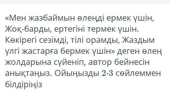 Автор "мен жазбаймын өлеңді ермек үшін" деген сөзде автор ойы: мен өлеңді еріккеннен жазбаймын дегенді білдіреді.Автор осылай өз бейнесін анықталды.