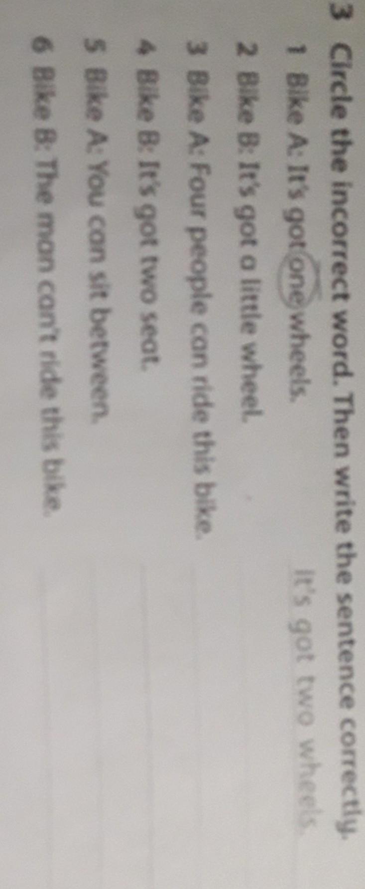1 B incorrect little correct:Its got big wheel. 3 A incorrect four correct:one people can ride this bike. 4 B incorrect two correct:its got one seat. пятый я не знаю. 6 B incorrect can't correct:the man can ride this bike