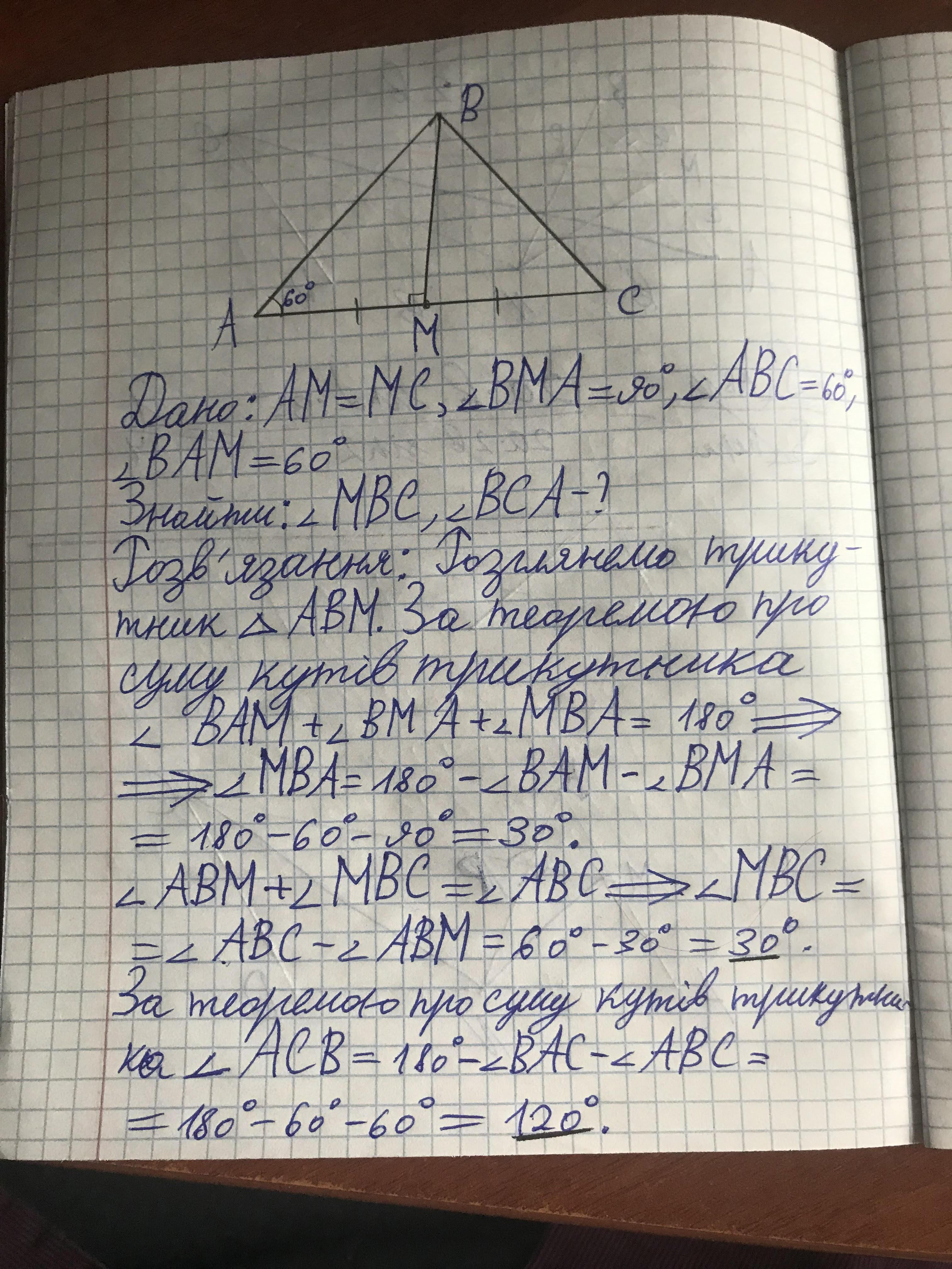 В треугольнике АВС точка М-середина стороны АС. Угол ВМА-90°, АВС-60°,ВАМ-60°Найдите углы МВС и ВСА