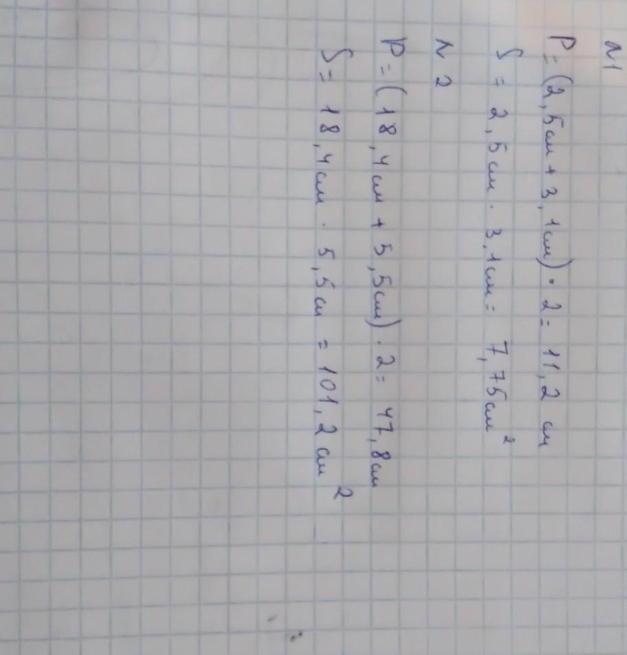 найти периметр P и площадь S прямоугольника со сторонами a и b, если: 1) a = 2,5 см b = 3,1 см 2) a=18,4 см, b=5,5 см