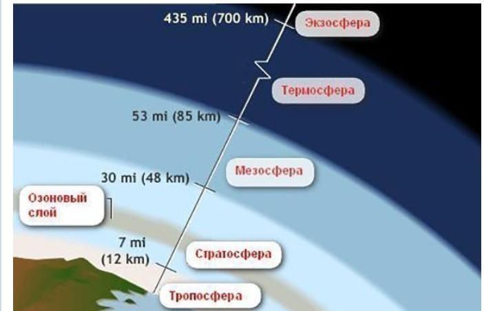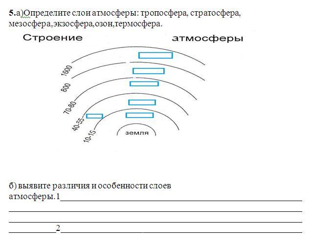 а)Определите слои атмосферы: тропосфера, стратосфера, мезосфера,экзосфера,озон,термосфера.