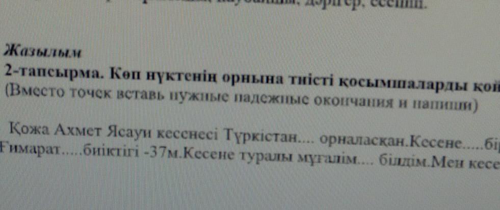 1 вместо точек: да,должно получится Түркістанда,потом в другой:незнаю,мало инфы,а третья: Ғимараттың,потом мұғалімнен білдім.