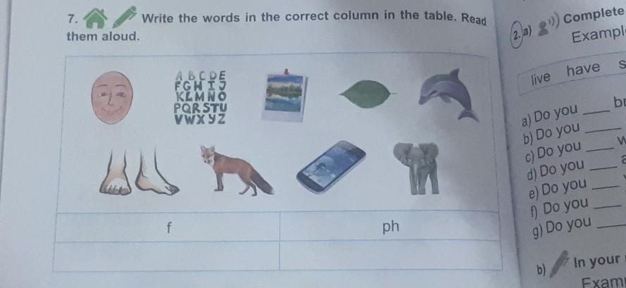 второй столбик: alphabet,photo,dolphin,telephone,elephant