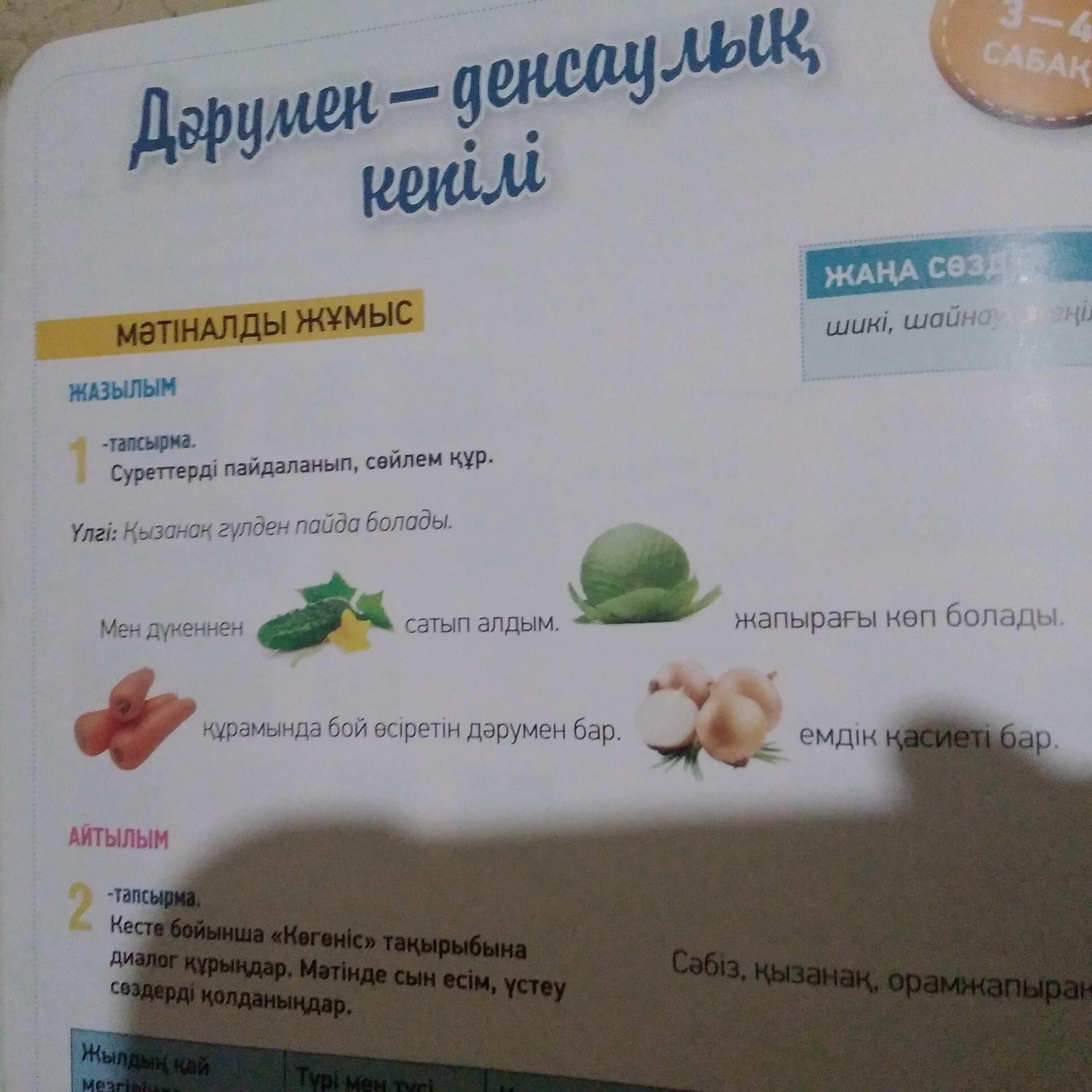 Мен дүкеннен қияр сатып алдым. Орамжапырақтың жапырағы көп болады. Сәбіздің құрамында бой өсіретін дәрумен бар. Пияздың емдік қасиеті бар