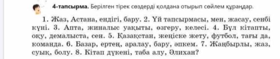 1.Ендігі жазда мен Астанаға барамын.2.Үй тапсырмасын мен сенбі күні істимін.3.Жиналыс уақыты келесі аптаға өзгерді.4.Сен бұл кітапты демалыста оқисын.5.Қазақстан фудбол командасы тағыда жеңіске жетті.6.Әпкем екеміз ертен базарды аралауға барамыз.7.Жазда жаңбыр жапқанда дала суық болады.8.Кітап дүкенін таптыңба Әлихан?