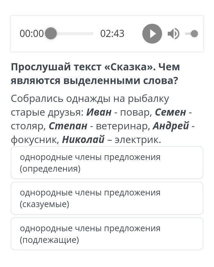 Прослушай текст "Сказка". Чем являются выделенные слова. Собрались однажды на рыбалку старые друзья: Иван- повар, Семен- столяр, Степан- ветеринар, Андрей- фокусник, Николай- электрик.