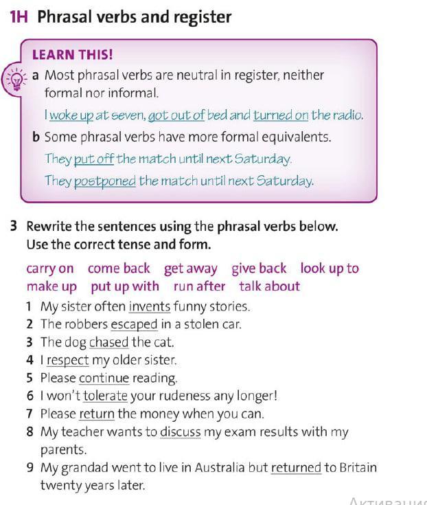 подставляем фразовые глаголы в предложениях вместо обычных глаголов.