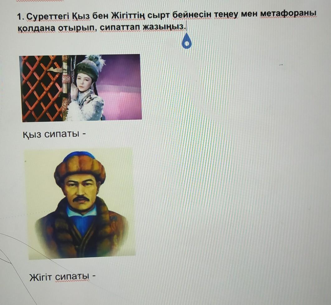 1. Суреттегі қыз бен жігіттің сырт бейнесін теңеу мен метафораны