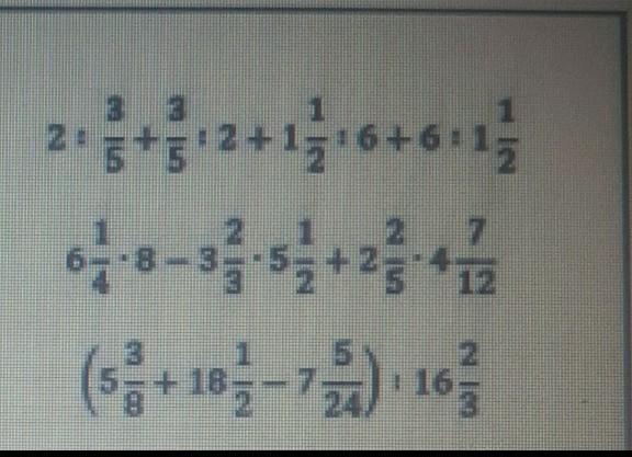 1)2:3/5 + 3/5: 2+1 1/2: 6+6: 1 1/2=2*5/3+ 3/5*1/2+3/2*1/6+6:3/2