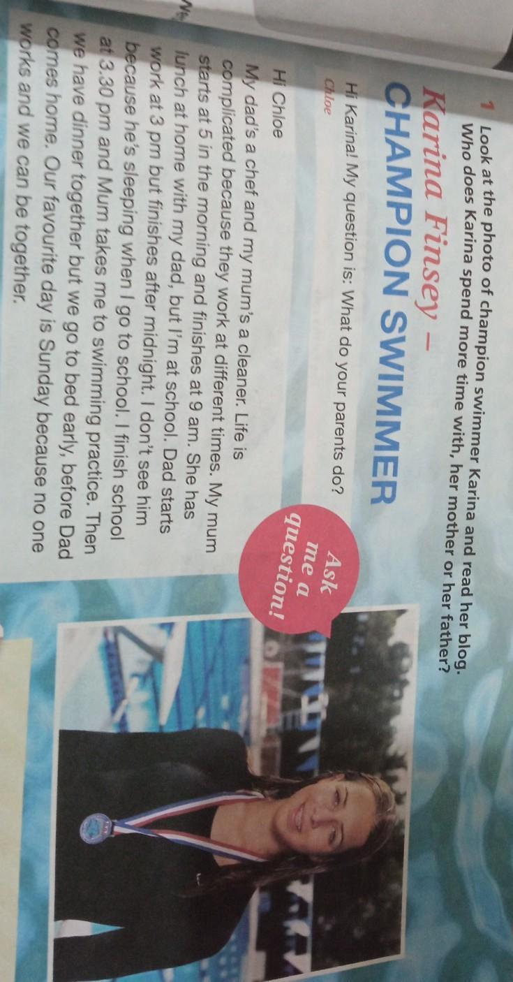 1 Look at the photo of champion swimmer Karina and read her blog.