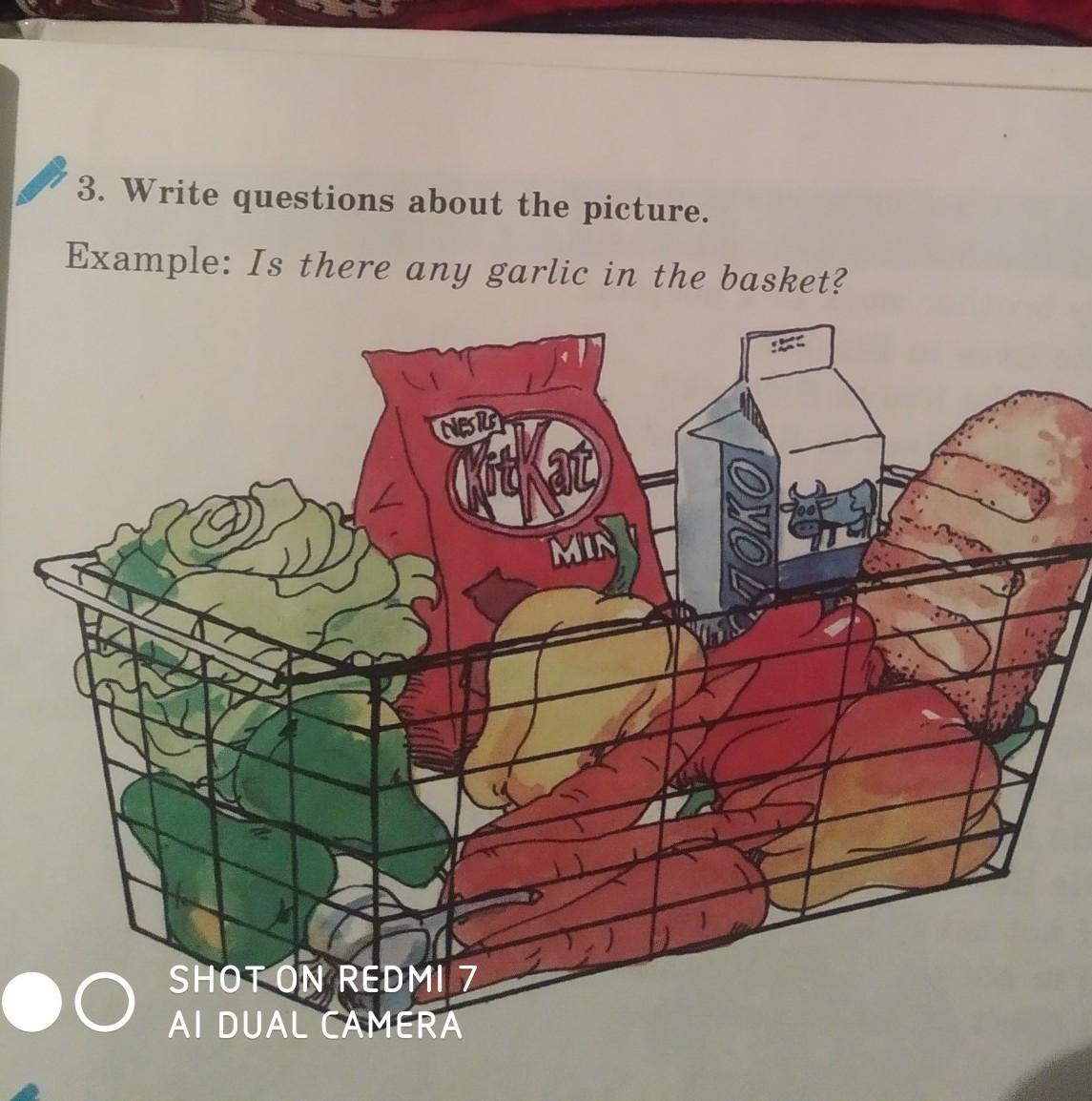 1.is there any milk in the basket?2. is there any cabbage in the basket?3. is there any candy in the basket?4. is there bread in the basket?5. is there any sweet pepper in the basket?6. are there any carrots in the basket?7. is there a pear in the basket?