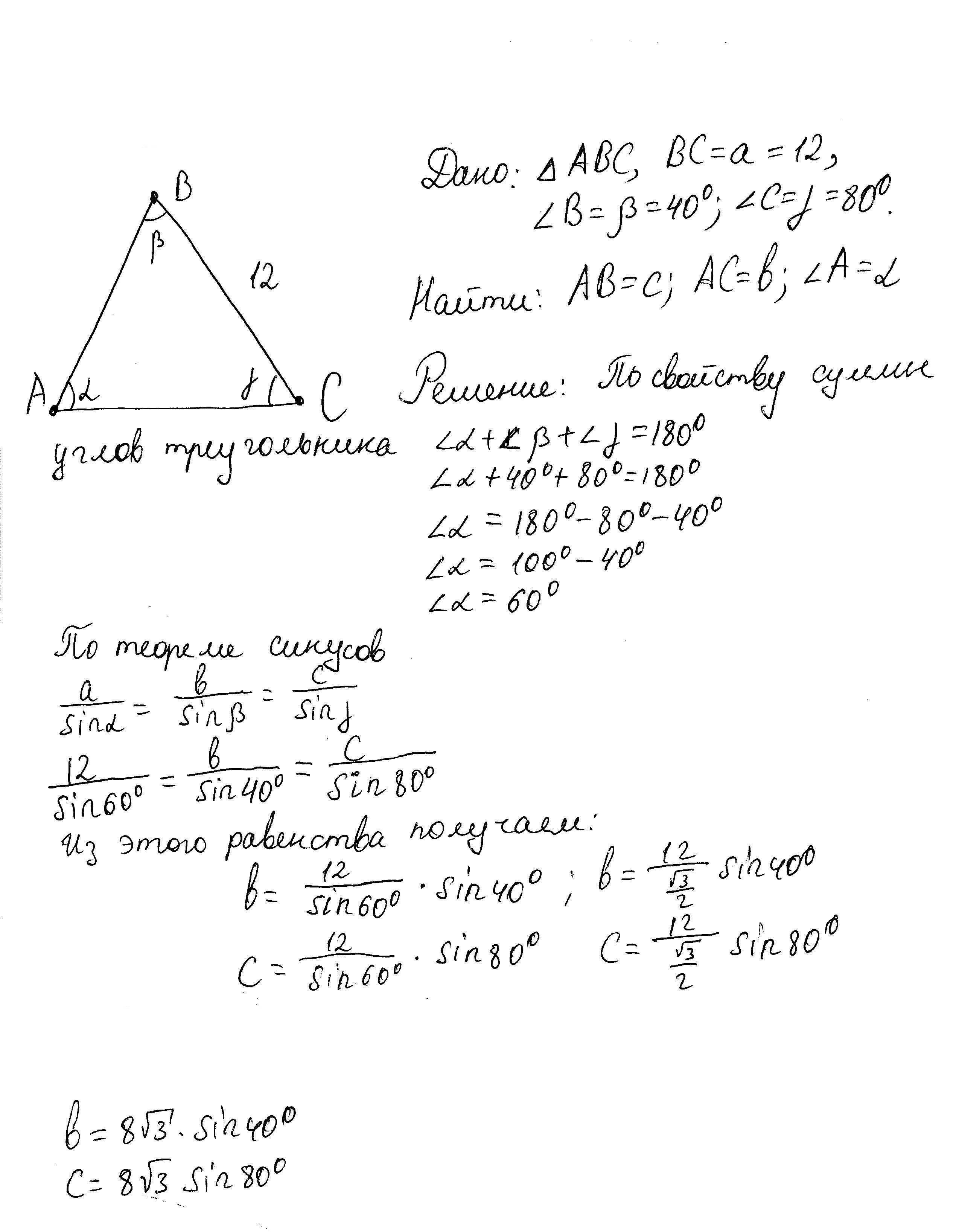 ∠α=60°, b=8√3sin40°, c=8√3sin80°