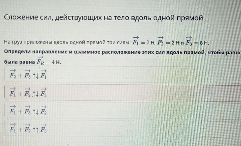 на груз приложены вдоль одной прямой три силы F1 равно 7 Ньютонов F2 равно 2 Ньютонов и F2 равно 5 Ньютонов определите направление взаимное расположение трёх чисел вдоль прямой чтобы равнодействующая была равна F R равно 4 Ньютон