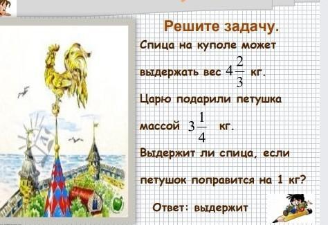 спица на куполе может выдержать вес 4 2/3 кг царю подарили петушка массой 3 1/4 кг выдержит ли спица если петушок поправится на 1 кг?
