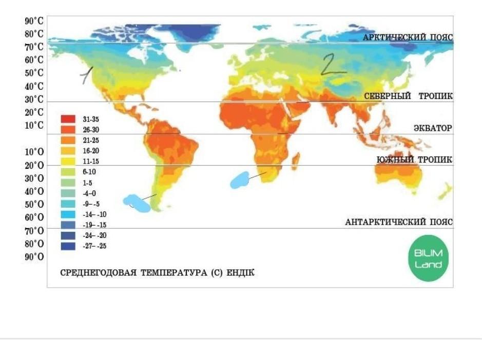 По климатической карте определи среднегодовую температуру регионов, обозначенных цифрами 1, 2, установи их сходство.(3 балла)