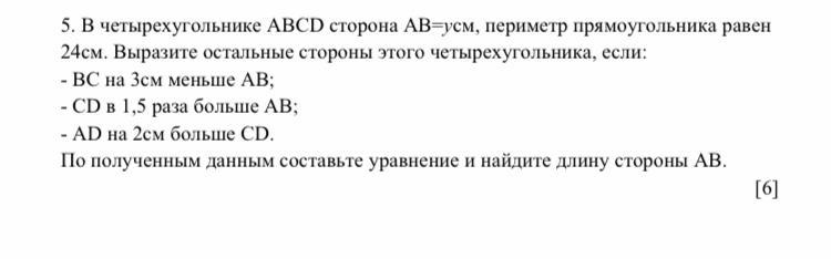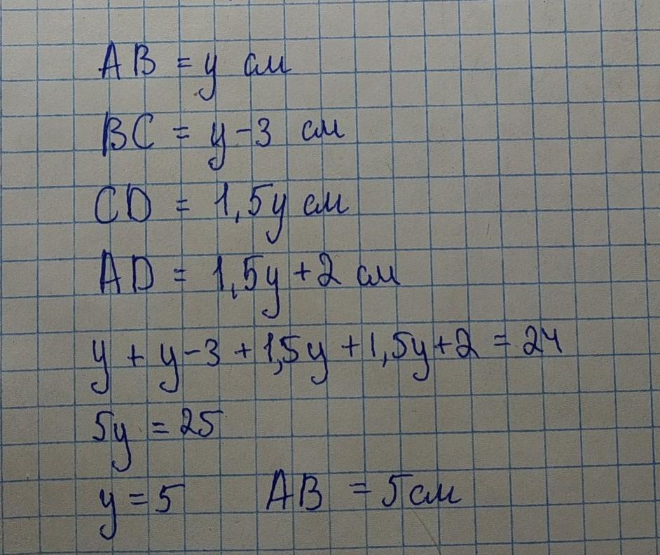 В четырехугольнике ABCD сторона AB=yсм, периметр прямоугольника равен 24см. Выразите остальные стороны этого четырехугольника, если: